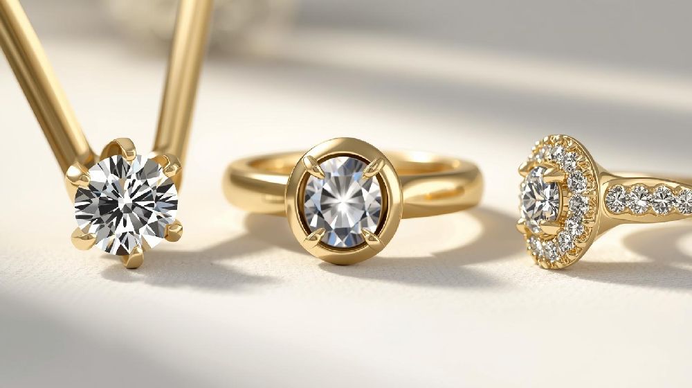 The prong setting is one of the most iconic and widely used techniques in gold jewelry. It uses small metal “claws” that hold the gemstone securely in place.