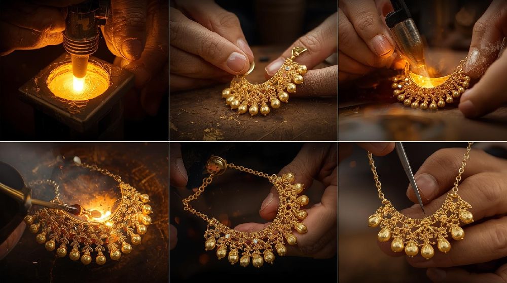 Molten gold—typically 22K or 24K—is carefully poured into the mold using advanced casting techniques such as lost-wax casting. After cooling, the mold is removed to reveal the raw gold form of the necklace. Precision at this stage ensures uniformity, strength, and flawless detailing.